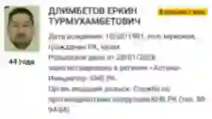 Согласно данным портала, Еркин Длимбетов разыскивается с 28 января 2026 года. Розыскное дело зарегистрировано в Астане.