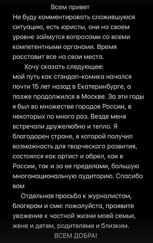 По словам артиста, всеми юридическими аспектами ситуации в настоящее время занимаются его представители и компетентные органы, поэтому он не считает возможным подробно комментировать произошедшее.